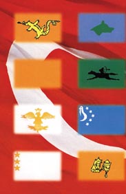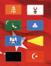 ![]() ![]() 16 Türk devletinin bayrakları soldan sağa, Hun Devleti, Göktürk Devleti, Karahanlılar, Altınordu Hanlığı, Batı Hun İmparatorluğu, Avar Devleti, Gazneniler, Timurlar Devleti, Avrupa Hunları, Hazar Devleti, Büyük Selçuklu İmparatorluğu, Babûr Devleti, Akhunlar, Uygur Hakanlığı, Hârizmşahlar, Osmanlı İmparatorluğu. |