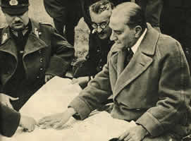 ![]() Çalışkanlığı ile örnek bir lider olan Atatürk, Orgeneral Ali Fuat Eren ve yanında Halis Bıyıktay ile birlikte harekat planını takip ederken. |