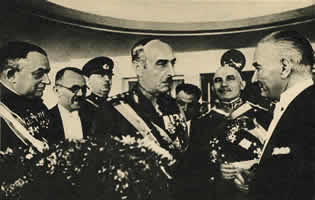 ![]() Barış yanlısı bir politika izleyen Atatürk savaşın nefsi müdafa için gerekli olduğunu her zaman dile getirirdi. Atatürk, Cumhuriyetin 14. yıldönümünde hipodromda yapılan törende, Romanya, Yunan ve Yugoslav Genel Kurmay başkanlarıyla birlikte. |