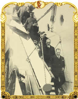 ![]() Atatürk, Karadeniz gemisindeki seyyar sergiyi ziyaretinden sonra gemiden ayrılırken görülüyor. |