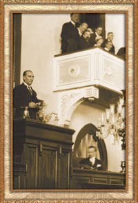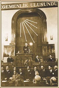 ![]() Atatürk'ün milletine duyduğu sevgi ve saygının en önemli örneklerinden birisi, egemenliğin yalnızca millete ait olması gerektiğini söylemesiydi. 1920'de kurulan TBMM ise, milli egemenliğin temsil edildiği en önemli kurumdur. |