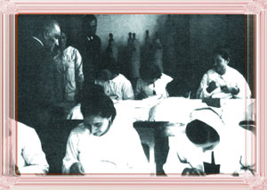 ![]() Gençlerin muhakkak bir meslek sahibi olması gerektiğine inanan Atatürk, Adana Kız Enstitüsü'nü gezerken. |