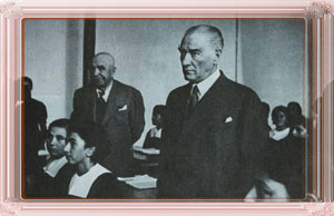 ![]() Gençlerin milli tarih bilincini kazanmalarının önemine sık sık dikkat çeken Atamız, Adana Kız Enstitüsü'nde bir tarih dersini izlerken. |