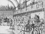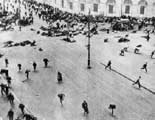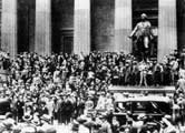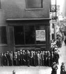 ![]() 1929 Bunalımı, dünya ticaretinin gerilemesine, toplumların gelir ve refah seviyelerinin düşmesine neden olmuş, ve milyonlarca insanı işsiz bırakmıştır. En alttaki resimde, o dönemdeiş bulmak için kuyrukta bekleyen insanlar görülmektedir. |