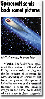 ![]() Am 6. März 1986 flog die sowjetische Raumsonde Vega-1 in 5.500 Meilen Entfernung am Halleyschen Kometen vorbei und sendete die ersten Bilder des Eiskerns des Kometen. |