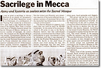 ![]() 1979 gab es ein Massaker nach einem Angriff auf die Kaaba während der Hadsch, genau wie in einem Hadith offenbart worden war. Der blutige Angriff fand statt am 1. Muharram 1400, (21. November 1979), also am ersten Tag des Jahres 1400 nach der Hidschra, am Beginn der Periode, als die Zeichen der Endzeit begannen, aufeinander zu folgen. |