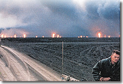 ![]() Im Juli 1991 überfiel der Irak Kuwait, und nachdem die Ölquellen angezündet worden waren, standen Kuwait und der Persische Golf in Flammen. |