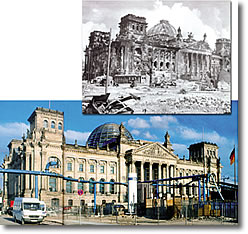 ![]() Der Reichstag in Berlin nach seiner Zerstörung 1945. Das Bild unten zeigt dasselbe Gebäude 1999, nach der Rekonstruktion. Viele Gebäude werden zur Zeit restauriert und in ihren früheren Zustand versetzt. |